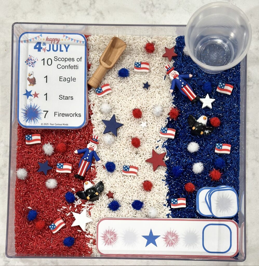 👉 Patriotic Sensory Bin Kit – Complete with red, white, and blue rice, pom-poms, flag erasers, scoops, and learning cards.