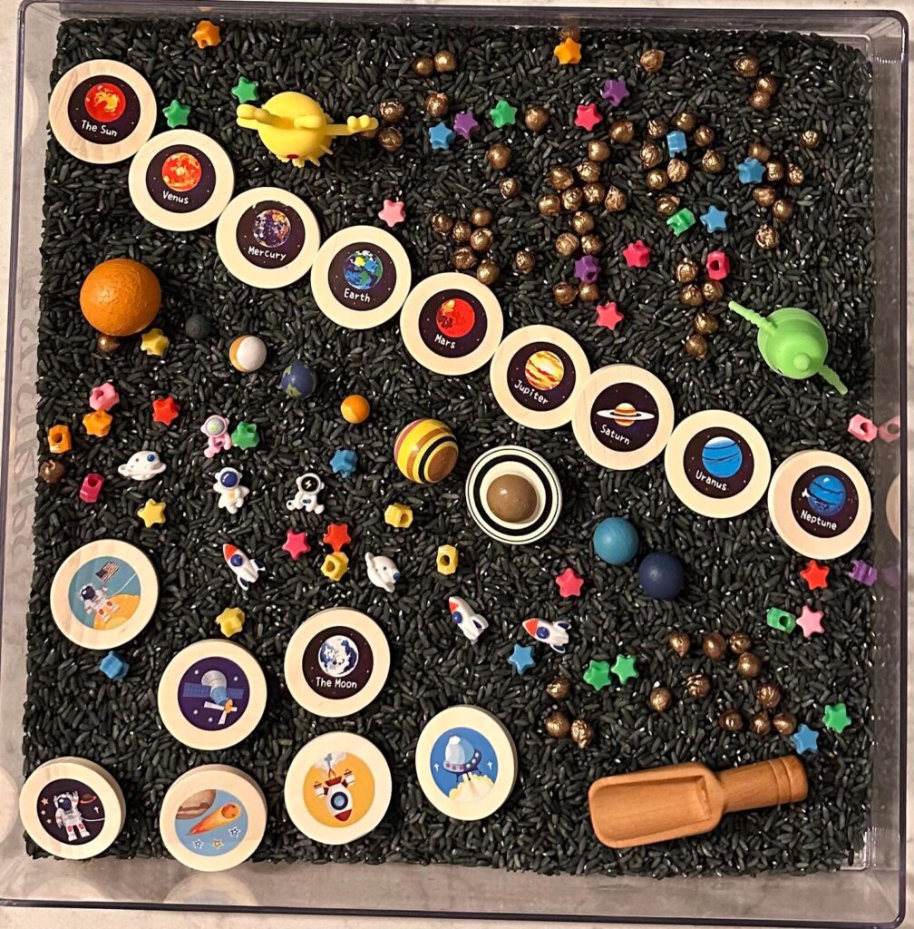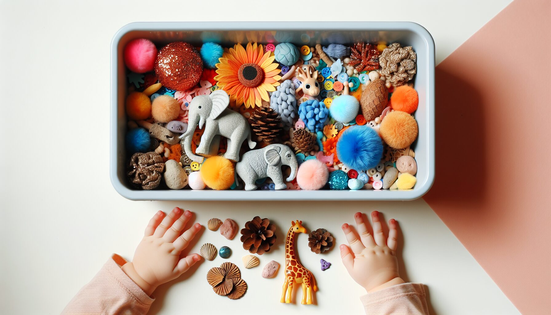 You fill a container with a base (like colored rice, beans, or water beads), then toss in themed objects—animals, letters, erasers, pom-poms, scoops, and more. Each bin becomes its own little adventure!